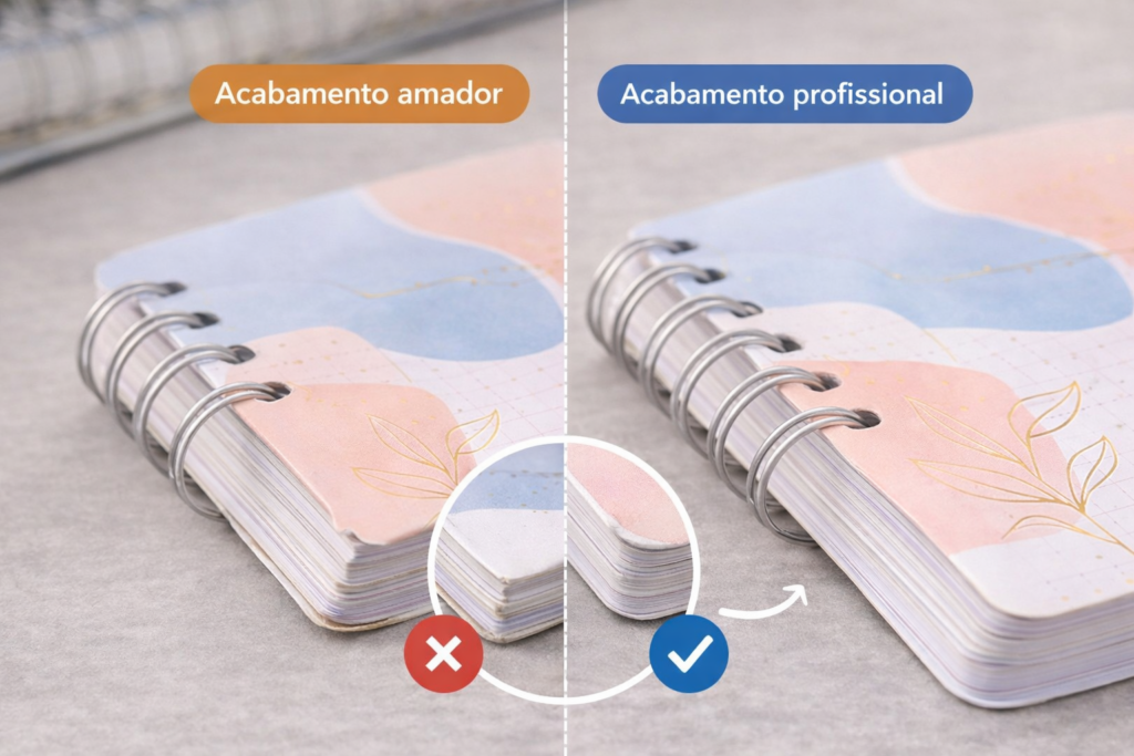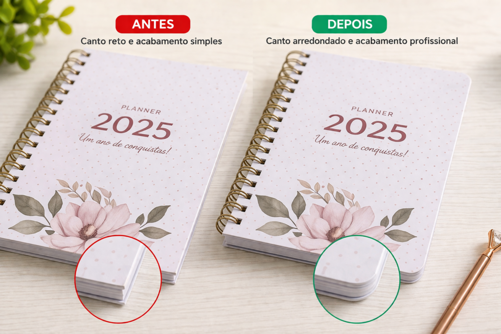 Um planner pode estar bem diagramado, com uma boa impressão e até com uma plastificação correta. Mas se os cantos estão retos, levemente desalinhados ou com acabamento irregular, o produto perde valor visual imediatamente.
