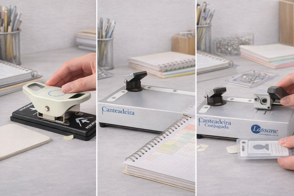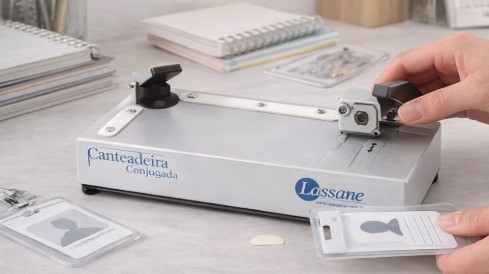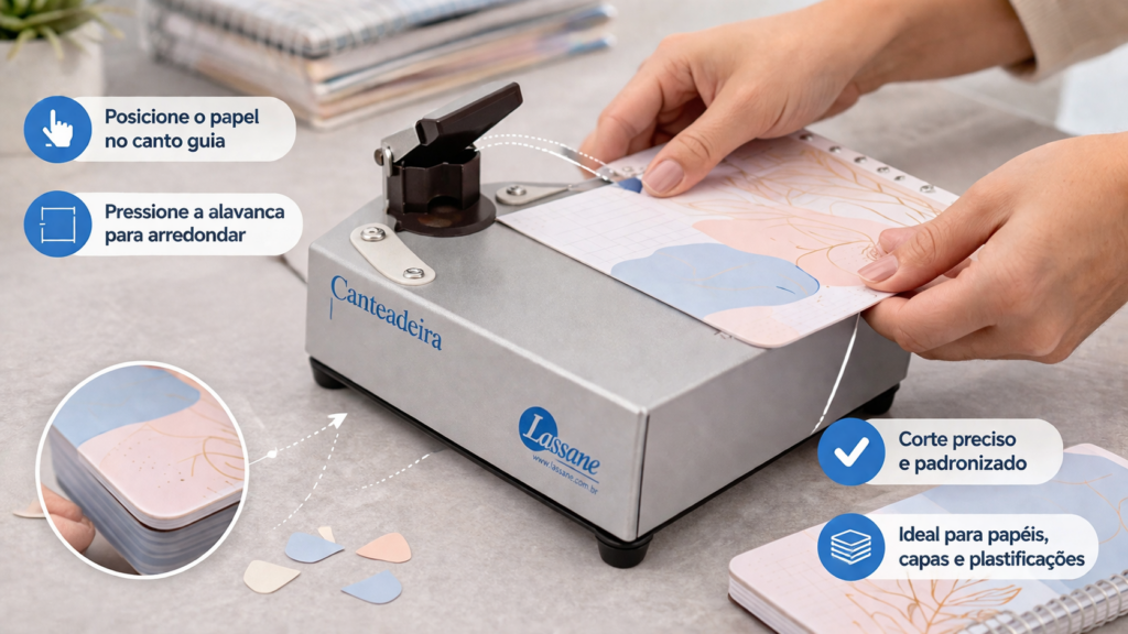 Os modelos mais simples, como a canteadeira Lassane para cantos arredondados, atendem muito bem quem está começando ou trabalha com materiais mais leves. Ela possui estrutura em aço tratado, é fácil de operar e entrega um corte padrão de aproximadamente 5mm, que já resolve grande parte das aplicações básicas, como papéis, documentos, cartões e plastificações mais simples.