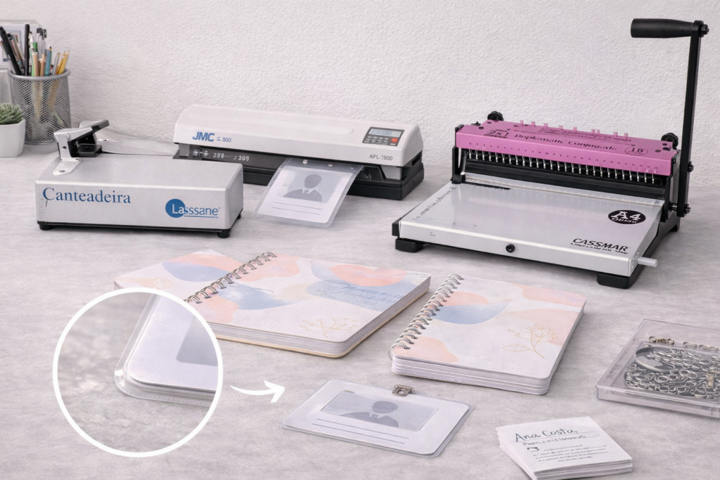 Além do acabamento, você passa a conseguir criar peças funcionais, como crachás, identificações e produtos com encaixe para cordões, sem precisar de outro equipamento. Isso traz ganho de tempo, padronização e produtividade.
