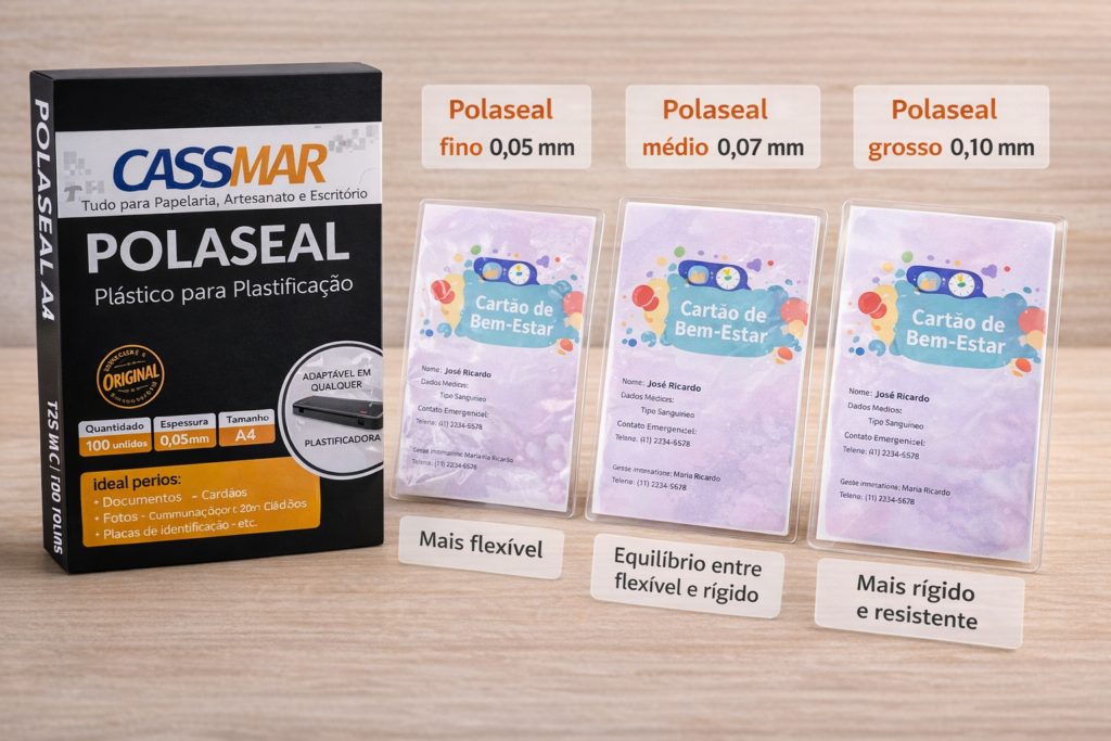 Se você estiver plastificando documentos simples, um polaseal mais fino já resolve. Mas se a ideia for produzir algo que precise de mais estrutura, como capas ou materiais mais duráveis, o ideal é trabalhar com espessuras maiores.