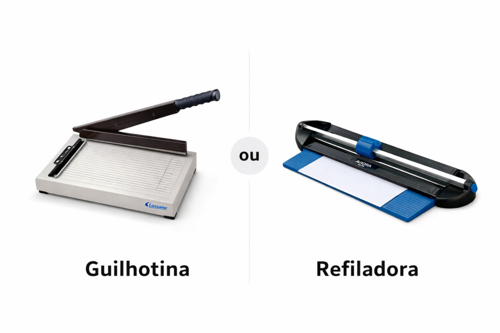 De forma simples, as duas ajudam no corte do papel, mas têm propostas um pouco diferentes no dia a dia. A guilhotina é mais indicada quando você precisa cortar várias folhas de uma vez, com rapidez e praticidade. Já a refiladora costuma ser usada para cortes mais leves e ajustes finais, quando você precisa de mais delicadeza.